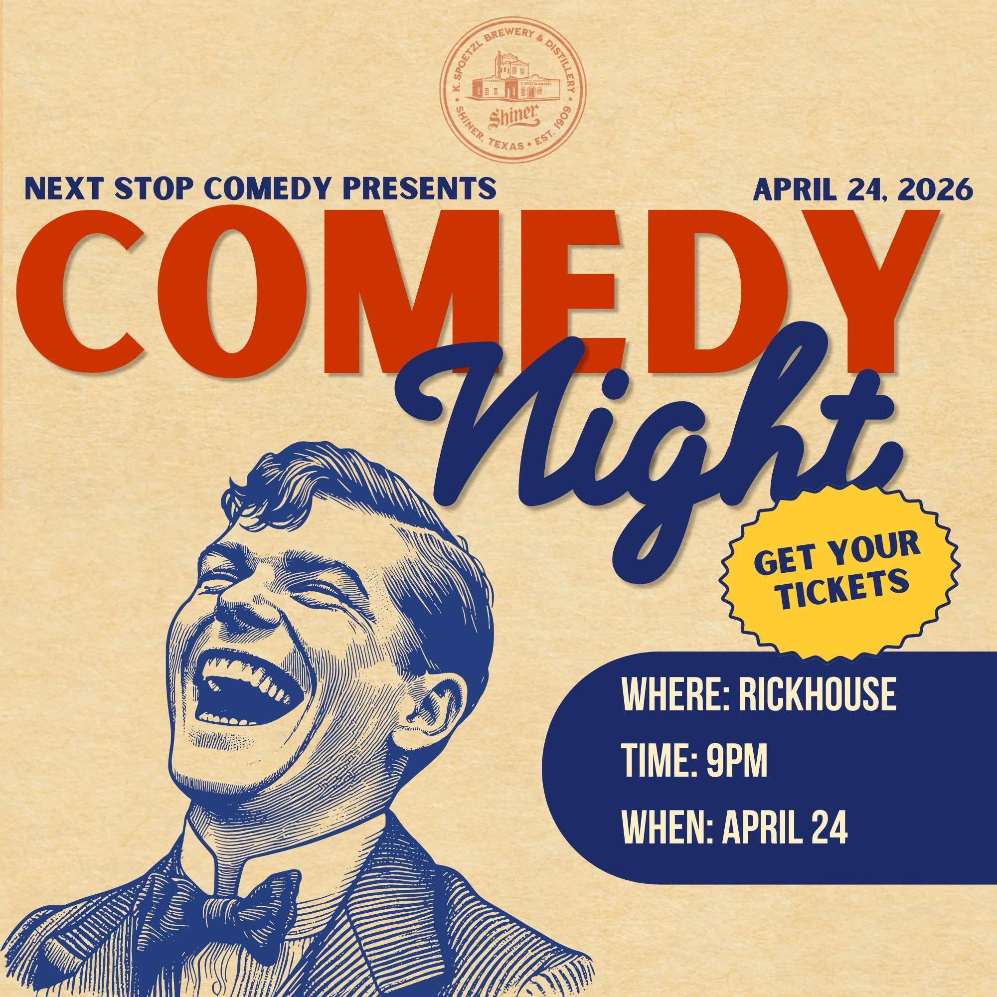 Spoetzl Brewery & Distillery is bringing back Comedy Night at the Rickhouse on Friday, April 24th at 9 PM—and this time they’ve teamed up with Next Stop Comedy to deliver a lineup that should keep things lively.