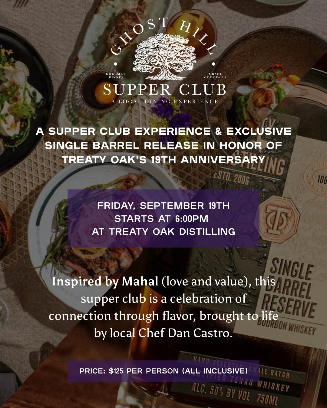 Treaty Oak Distilling is celebrating 19 years of Texas whiskey innovation with a night you won’t want to miss. The Ghost Hill Supper Club returns Friday, September 19th at 6 PM, pairing a one-of-a-kind dining experience with an exclusive single barrel release.