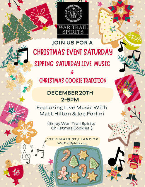 War Trail Spirits is wrapping up their holiday event series with another cozy Saturday in Llano — this one built around live music, cookies, and a whole lot of Christmas spirit. If you’re looking for a laid-back way to spend an afternoon before the holiday rush hits full speed, this Sipping Saturday Live Music & Christmas Cookie Tradition is a solid choice.